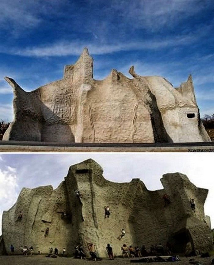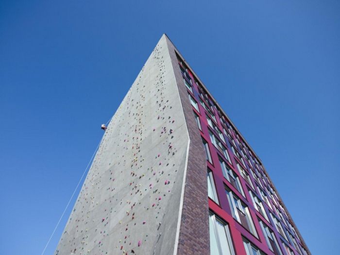 Люди буквально поднимаются на стену здания, расположенного на территории Университета Энсхеда. Стена для скалолазания, построенная местным клубом альпинизма, включена в общую архитектуру здания. Она призвана нести не только декоративную функцию, но и формировать окончательную форму постройки.