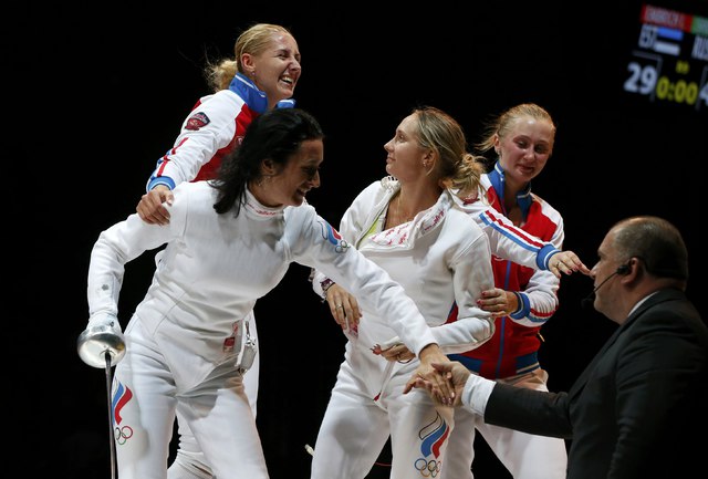 Женская сборная России взяла верх над Эстонией в финале командных соревнований шпажисток на чемпионате мира в Казани со счетом 40:29. В составе россиянок отличились Татьяна Гудкова, Любовь Шутова и Виолетта Колобова. Фото AFP, REUTERS