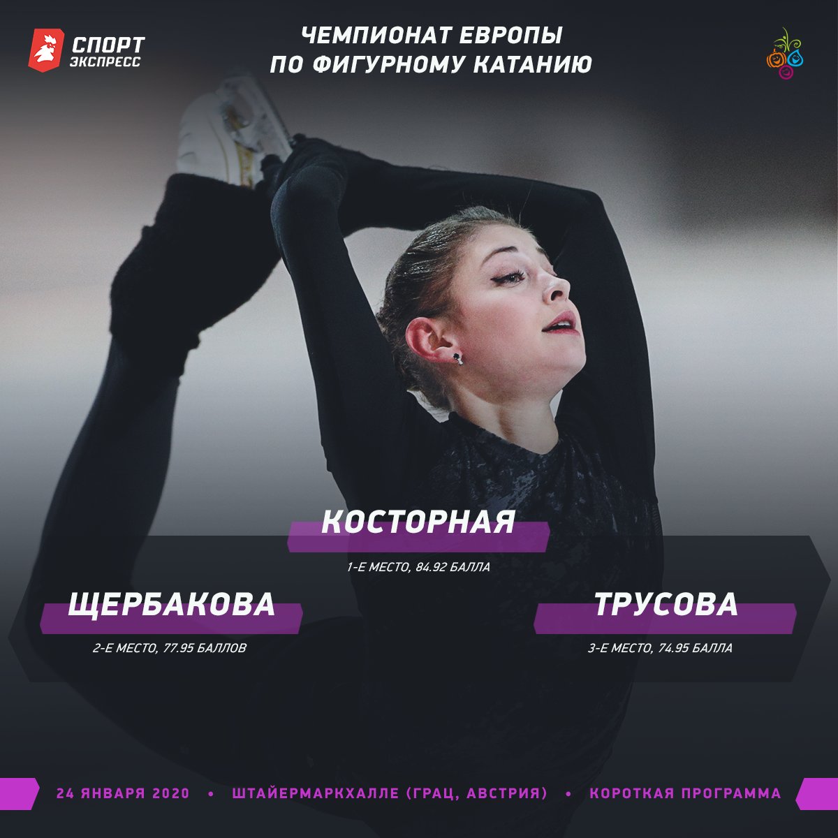 Алена Косторная выиграла короткую программу на чемпионате Европы по фигурному катанию, в четвертый раз в сезоне набрав в ней более 84 баллов. За ней, как и на недавнем чемпионате России, расположились подруги по группе Анна Щербакова и Александра Трусова, а швейцарца Алексия Паганини отстала от Алены на фантастические 16,13 балла. Ученицы Этери Тутберидзе в третий раз подряд завершили короткую программу крупного турнира в одинаковом порядке. На декабрьском финале «Гран-при» Косторная была первой, Щербакова — третьей, а Трусова — пятой.