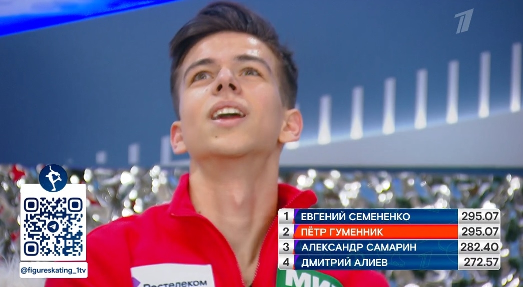 Петр Гуменник (190.60) получает в сумме столько же сколько и Евгений Семененко — 295.07. Но выигрывает Семененко, так как в таком случае роль играет результат в произволке, который был выше у Евгения.