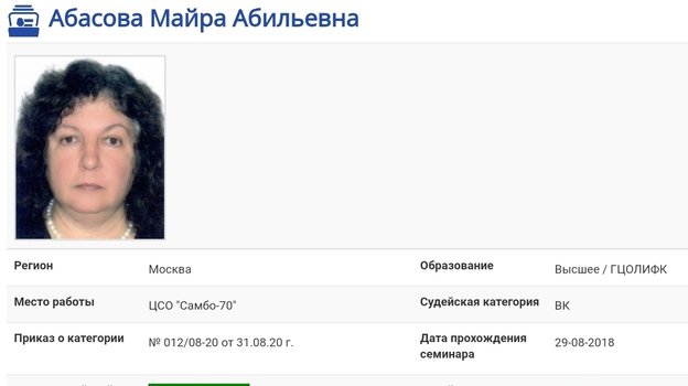 Для того чтобы установить факт работы Абасовой в «Самбо-70», не нужно устанавливать камеру перед входом в «Хрустальный» и сидеть в кустах, снимая всех вошедших. Доказательство — на сайте федерации в карточке судьи Абасовой.