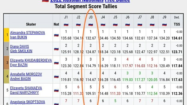И Абасова действительно судила, выделяясь на общем фоне. Она не ставила паре из своей школы самые лучшие оценки — 84,74 балла в ритм-танце (итог 83,99), 124,87 в произвольном (итог 123,71). Были и более высокие. Например, от уже упоминаемой необъяснимой судьи Хмызенко, которая ставила «-3» за падения Щербаковой и Трусовой в женском одиночном катании, а у пар ставила самые высокие в бригаде оценки Тарасовой и Морозову и самые низкие — Павлюченко и Ходыкину.