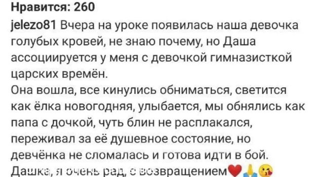 «Вчера на уроке появилась наша девочка голубых кровей. Не знаю почему, но Даша ассоциируется у меня с девочкой-гимназисткой царских времен. Она вошла, все кинулись обниматься, светится, как елка новогодняя, улыбается. Мы обнялись как папа с дочкой, чуть, блин, не расплакался, переживал за ее душевное состояние, но девчонка не сломалась и готова идти в бой. Дашка, я очень рад, с возвращением», — написал Железняков в Instagram.