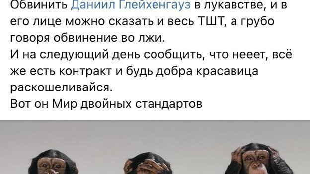 - Я уже ничего не понимаю, что происходит с этим Миром! Обвинить Даниила Глейхенгауза в лукавстве, и в его лице можно сказать и весь ТШТ, агрубо говоря обвинение во лжи. И на следующий день сообщить, что нет, все же есть контракт и будь добра красавица раскошеливайся. Вот он. Мир двойных стандартов, — написал Железняков в Facebook.