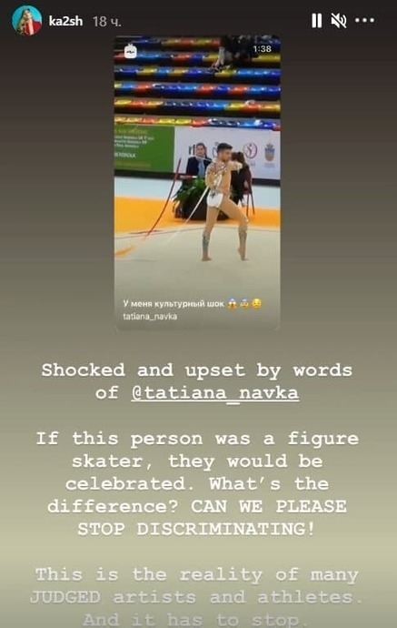22 июля Навка опубликовала пост, в котором выступила против мужчин в художественной гимнастике. Она заявила, что это чисто женская дисциплина и участие мужчин в данных соревнованиях — перебор.