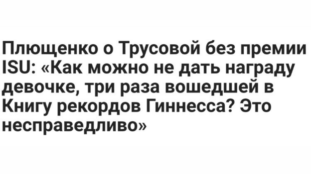 Он высказался по этому поводу: «Как можно не дать награду девочке, три раза вошедшей в Книгу рекордов Гиннесса? Это несправедливо». Трусова тренируется в академии Плющенко. Победу в номинации одержала ученица Этери Тутберидзе Алена Косторная.
