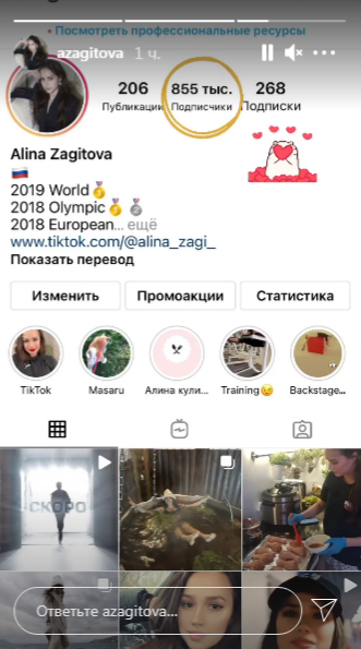 18-летняя Загитова в истории опубликовала статистику, где видно, что у нее 855 тысяч подписчиков, что на 2 тысячи больше, нежели у Евгении Медведевой, которая ранее была лидером.