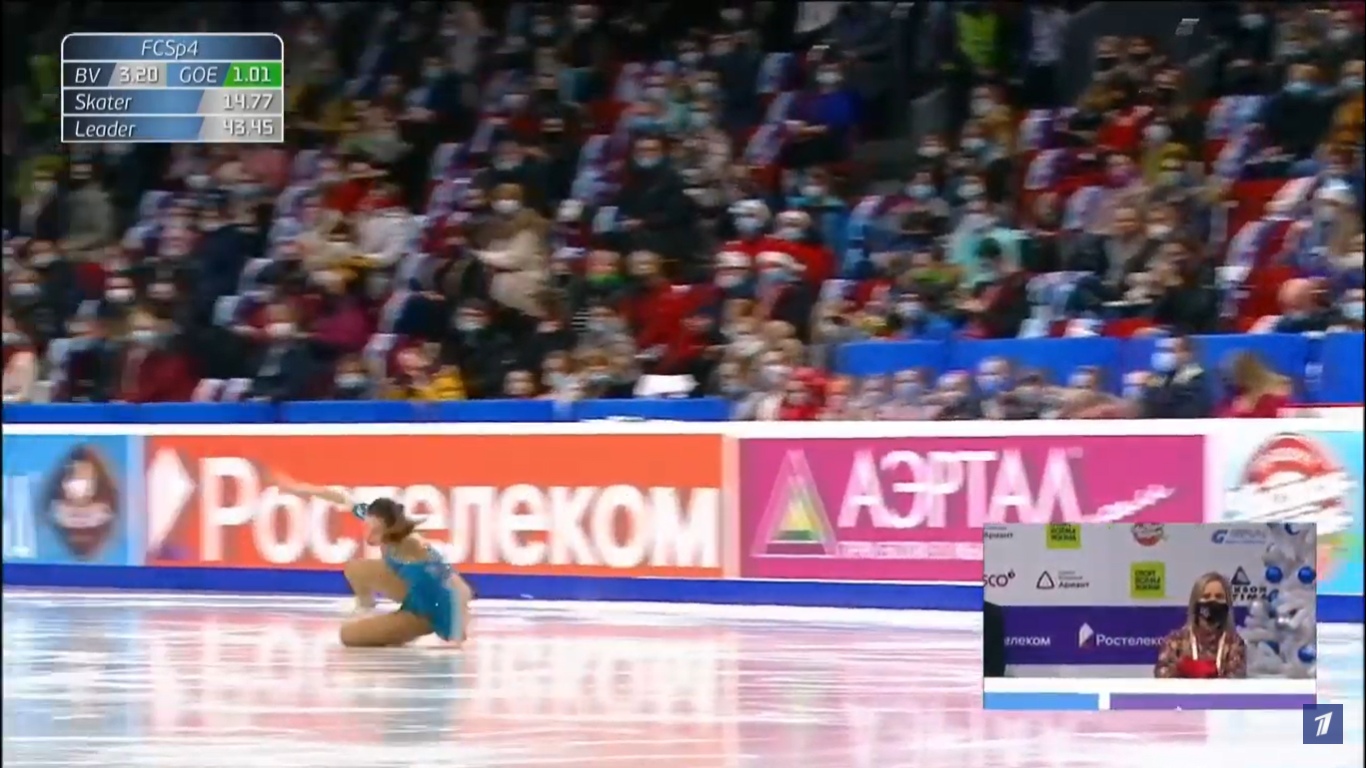 Елизавета Туктамышева второй претенденткой за день идет на тройной аксель и в отличие от Камилы Валиевой сегодня выполняет его, хотя и недостаточно чисто — с помаркой при приземлении.