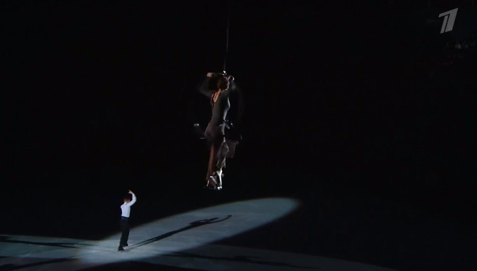 Михаил Коляда разделил номер с воздушной гимнасткой. Получилось очень эффектно. Правда позже, когда гимнастка спустилась на лед, стало понятно, что это Дарья Беклемищева — супруга Михаила.