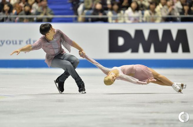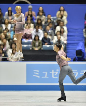 Фигурное катание. Токио. Командный чемпионат мира. Пары. Произвольная программа. Итог. 1. ВОЛОСОЖАР/ТРАНЬКОВ (Россия) - 210,47. 2. Дюамель/Рэдфорд (Канада) - 191,15. 3 Пэн Чэн/Чжан Хао (Китай) - 174,40. Россияне Татьяна Волосожар и Максим Траньков вслед за победой в короткой программе показали лучший результат и в произвольной, выиграв, таким образом, соревнования. Фото AFP