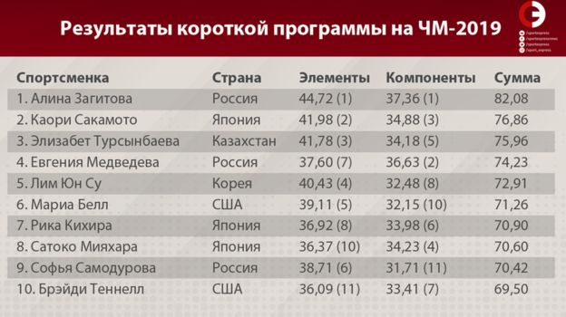 После короткой программы на чемпионате мира в Японии лидерство захватила Алина Загитова, получившая лучшие оценки и за элементы и за компоненты. Олимпийская чемпионка Пхенчхана опережает ближайшую преследовательницу Каори Сакамото на 5,22 балла, а лидера мирового сезона Рику Кихиру – 11,18.