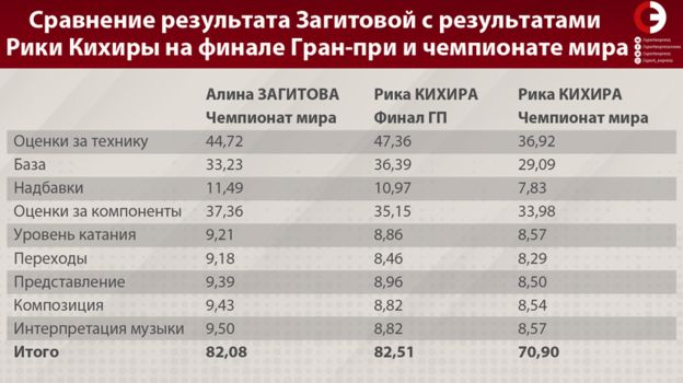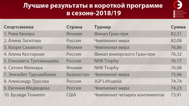 Результат 82,08 балла – лучший для Загитовой в этом сезоне. Так много россиянка не получала даже на домашних турнирах – этапе "Гран-при" (80,78) и чемпионате России (80,62). Однако даже идеальный прокат в Сайтаме не позволил Алине добраться до мирового рекорда Рики Кихиры, которая в финале "Гран-при" в Ванкуверен набрала 82,51 балла. В десятку лучших результатов сезона попали еще четыре результата чемпионата мира – лучшие прокаты в году продемонстрировали Каори Сакамото (3-е место), Элизабет Турсынбаева (7-е) и Евгения Медведева (9-е).
