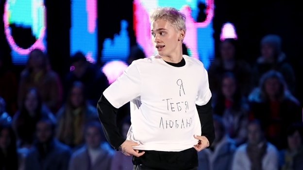 Выяснилось, что Даня Милохин на футболке признался своей партнерше в любви. Но в финале номера он решил с посланием распрощаться, потому что заподозрил Евгению в невзаимности.