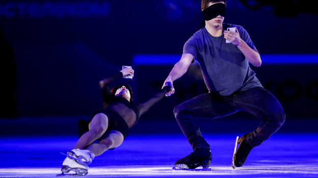 Еще вчера Денис Ходыкин рассказывал на пресс-конференции о том, что хочет усложняться, потому пары уже готовы совмещать хореографию в программах и элементы ультра-си, а сегодня снова доказывает вместе с партнершей Дарьей Павлюченко, что это возможно. Если готовиться к прокатам, то так, как этот дуэт. У них самые креативные соревновательные постановки, а уж о показательных и говорить нечего. Ребята буквально к каждому новому старту ставят новый номер. И в этот раз они откатались под «Вне зоны доступа» группы «312». Это могла получиться просто лирическая показательная программа, но в итоге оказалось что-то наполненное очень глубоким смыслом. Даша и Денис начали прокат с завязанными глазами, а у каждого при этом с собой был мобильный телефон. Даже тодес и поддержки были выполнены таким образом. Потом все-таки повязки были сняты, а телефоны отброшены. И в конце номера, когда Ходыкин захотел снова взять девайс, Павлюченко ему не позволила это сделать.
