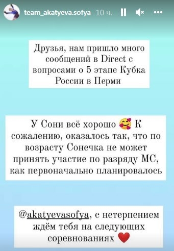 Отдельная и странная история произошла перед пермским этапом с Софьей Акатьевой. Она сначала якобы была заявлена на турнир, но потом пропала из списков участников. Как сообщила одна из ее фанатских групп, вице-чемпионка России среди юниоров не имела права заявляться на этап в разряде мастеров спорта по возрасту. Не очень объяснимо, почему это стало известно только перед этапом.