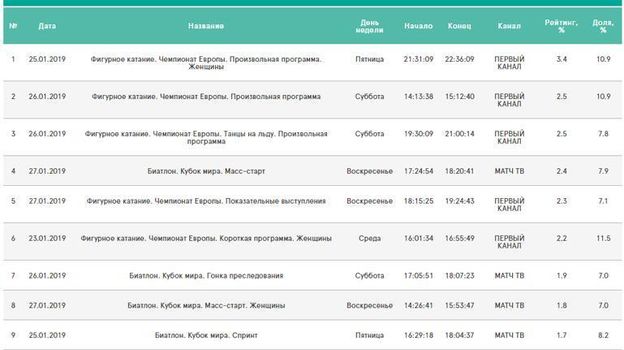 2) Фигурное катание на протяжении всего сезона доказывает, что является самым популярным видом спорта в России, по крайней мере – на телевидении. Но не стоит игнорировать тот факт, что основные соревнования транслируются на Первом – большом федеральном канале с максимальным охватом аудитории.