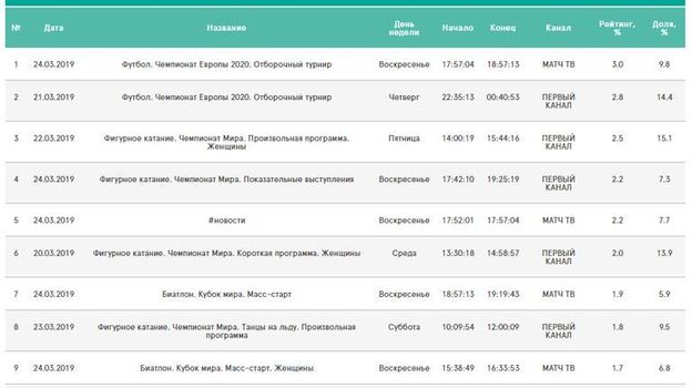 Добавим, что скандальный финал Кубка России телеаудитория не заметила, хотя Первый канал транслировал часть соревнований в телеэфире, а вот чемпионат мира и вовсе уступил и европейскому первенству, и российскому. Сыграло шутку не самое удобное время – японцы поставили женские соревнования на будние дни, на выходной ожидаемо оставив мужчин. Впрочем, и показательные выступления, которые транслировал Первый канал в записи в воскресенье, не были популярными. Женская произвольная программа и сумасшедшая битва с участием Загитовой и Медведевой привлекла только 2,5% зрителей (43-е место в общем рейтинге), гала-представления – 2,2% (53-е место). И в этот раз фигурное катание даже не смогло справиться с футбольным отбором на Евро-2020.