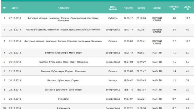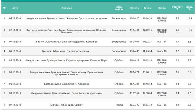 Гран-при. На неделе 3-9 декабря 2018 года фигурное катание в направлении “Спорт” действительно побило всех своих конкурентов. Трансляции шли утром в выходной день – довольно удобное для телезрителя время.