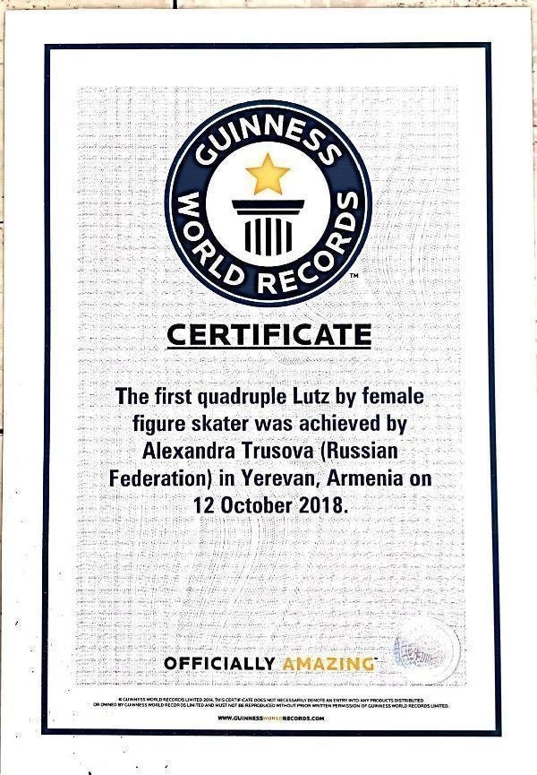 В 2012 году Guinness World Records провел публичную церемонию вручения сертификатов канадцу Патрику Чану за его рекордные оценки. Однако это было исключение из правил. Обычно сертификаты отсылаются рекордсменам с курьером. По крайней мере, Трусова торжественных церемоний пока не дождалась. Несмотря на то, что в прыжковой номинации она была всего лишь второй фигуристкой после Микки Андо с четверным сальховом, который, к слову, второй после японки исполнила тоже Александра.