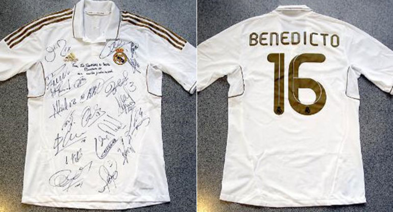 Папа римский Бенедикт XVI, побывавший с визитом в Испании по приглашению короля страны, получил подарок от "Реала". В частности, главе католической церкви подарили футболку испанского гранда с автографами всех футболистов команды. Кроме того, на футболке нанесен номер 16, информирует Marca.