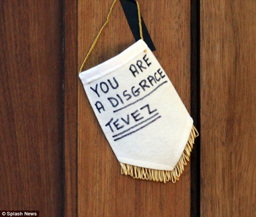 Болельщики "Манчестер Сити" выразили свое недовольство нападающему Карлосу Тевесу. Напомним, аргентинец отказался выходить на замену в недавнем матче Лиги чемпионов против "Баварии", за что был отстранен от работы с командой. Как сообщает Daily Mail, на ворота дома Тевеса повесили вымпел с надписью "Тевес – ты позор!".