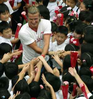 Дэвид Бекхэм, теперь уже футболист мадридского "Реала", в ходе своей поездки в Японию, посетил школу в Токио. Ученики встретили своего кумира цветами, а Дэвид подарил им свою футболку (не "Манчестер Юнайтед" и не "Реала", а сборной Англии) с надписью: "Пусть счастье цветет в вашем сердце. Д. Бекхэм". |