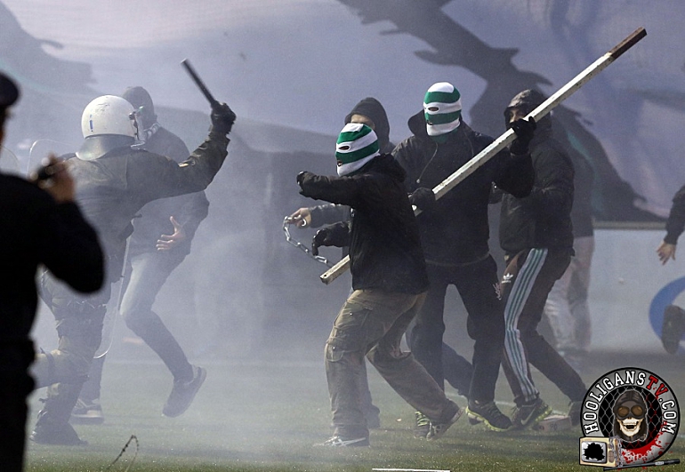 Центральный матч 25-го тура чемпионата Греции "Панатинаикос" – "Олимпиакос" (2:1) едва не оказался под угрозой срыва, сообщает sport24.gr. Перед стартовым свистком главного судьи фанаты хозяев выбежали на поле с использованием пиротехники и ракетниц. Также в руках агрессивно настроенных людей были цепи, дубинки и даже металлические элементы ограждений трибун. Лишь вмешательство полиции, использовавшей слезотачивый газ, предотвратило столкновения между враждующими группировками болельщиков обоих клубов. В результате "боевых действий" начало матча было отложено на 15 минут.