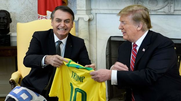 Президент США Дональд Трамп и глава государства в Бразилии Жаир Болсонару на встрече в Вашингтоне в Овальном кабинете Белого дома обменялись майками своих футбольных сборных, сообщает AFP.