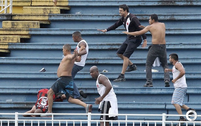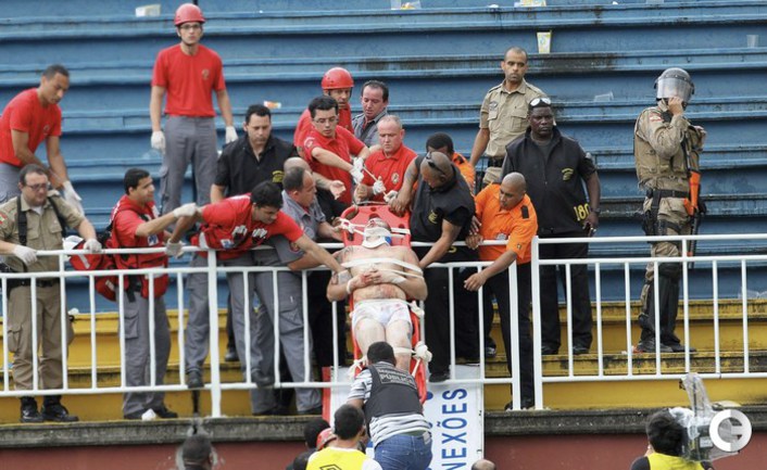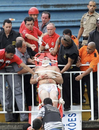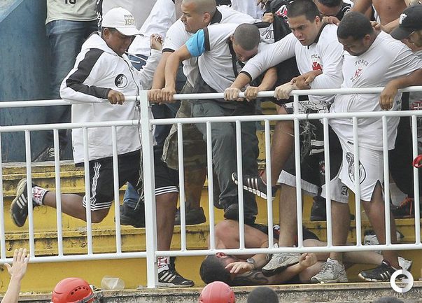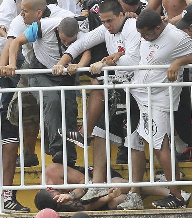 Матч чемпионата Бразилии по футболу "Атлетику Паранаэнсе" - "Васку да Гама" был прерван из-за массовых беспорядков на трибунах. Фанаты гостей смогли прорваться на трибуну болельщиков "Атлетику" и жестоко избили нескольких человек. Полиции пришлось применять слезоточивый газ. В ходе массовой драки один человек, упав с верхнего яруса трибуны, погиб на месте. Второй потерпевший скончался уже в больнице. Игра была продолжена примерно через 40 минут после наведения порядка на стадионе. Фото REUTERS