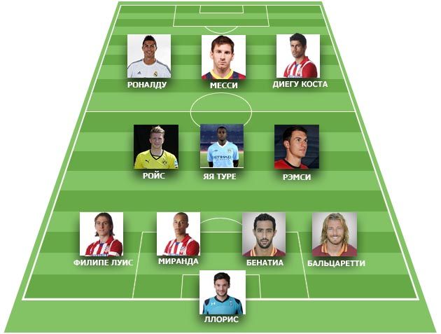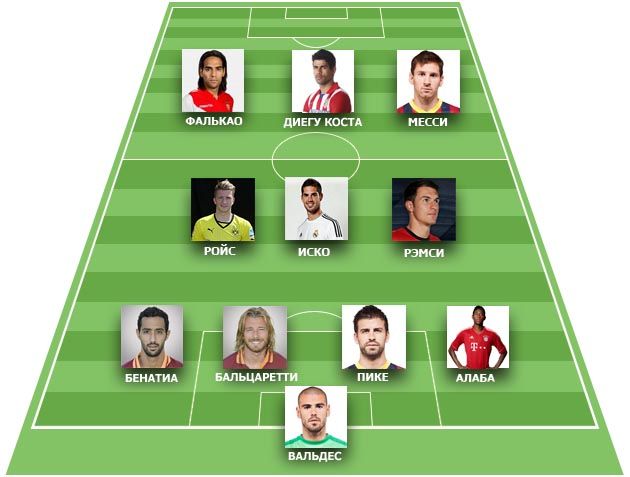 нападающие Месси ("Барселона", 10), Диегу Коста ("Атлетико", 9), Фалькао ("Монако", 5), Криштиану Роналду ("Реал", 4), Тотти ("Рома", 3), Альварес ("Интер", 1), Ибрагимович ("ПСЖ", 1), Левандовски ("Боруссия" Д, 1), Педро ("Барселона", 1), Руни ("Манчестер Юнайтед", 1), Старридж ("Ливерпуль", 1), Суарес ("Ливерпуль", 1).