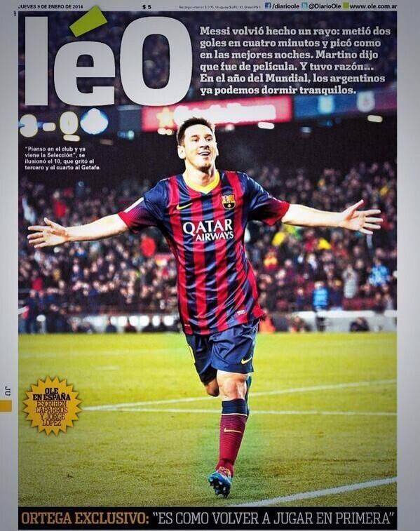 Главная аргентинская спортивная газета Ol? на один день переименовалась в L?o – в честь триумфального возвращения Месси в строй после двух месяцев восстановления от травмы и двух его голов в первом же матче – в ворота "Хетафе". "Его возвращение подобно молнии, – написано на первой полосе Ol?. – Он забил два гола за четыре минуты, завершая атаки, как в своих лучших матчах. Мартино сказал, что это возвращение было словно взято из кинофильма. И он прав… В год чемпионата мира аргентинцы могут спать спокойно".