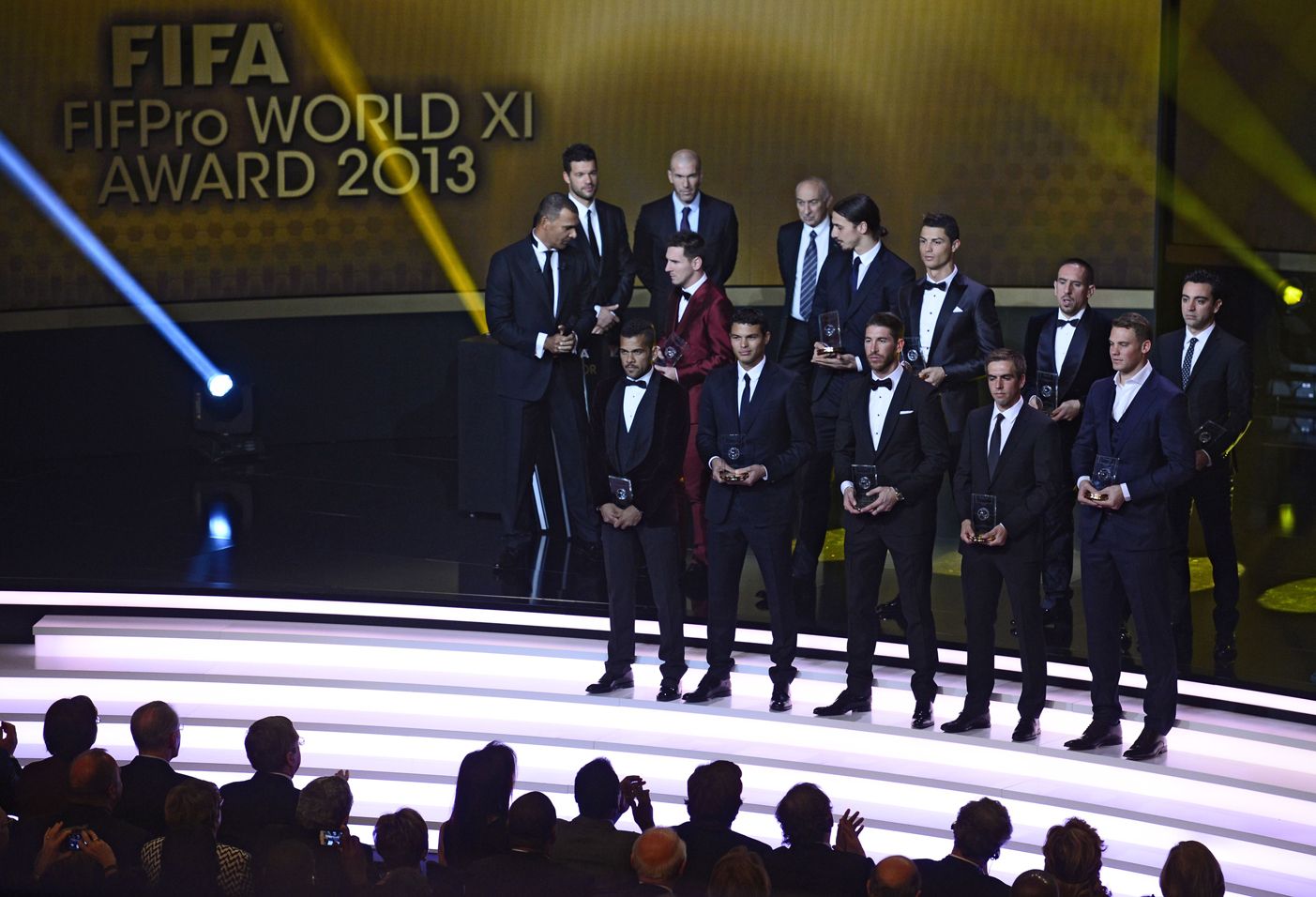 Началась церемония с "собирания" символической команды 2013 года по версии Международного профсоюза футболистов (FIFPro). Эта сборная была сформирована по итогам голосования 50 тысяч профессиональных футболистов. В нее вошли: вратарь – Мануэль Нойер (Германия, "Бавария"), защитники – Филипп Лам (Германия, "Бавария), Серхио Рамос (Испания, "Реал"), Тиагу Силва (Бразилия, "ПСЖ"), Даниэл Алвес (Бразилия, "Барселона"), полузащитники – Андрес Иньеста, Хави (оба – Испания, "Барселона"), Франк Рибери (Франция, "Бавария"), нападающие – Криштиану Роналду (Португалия, "Реал"), Златан Ибрагимович (Швеция, "ПСЖ"), Лионель Месси (Аргентина, "Барселона").