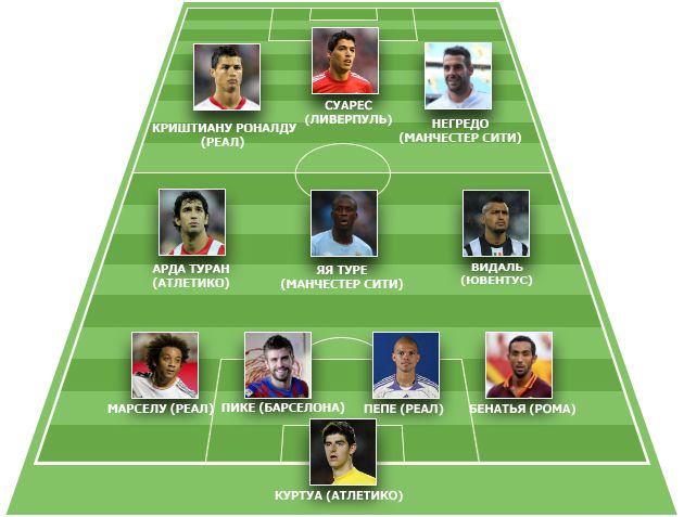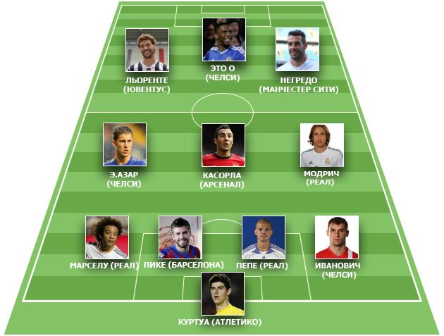 Вариант "СЭ" выглядит так: Куртуа; Иванович ("Челси"), Пике ("Барселона"), Пепе, Марселу; Модрич (все - "Реал"), Касорла ("Арсенал"), Э.Азар ("Челси"); Негредо, Это'О ("Челси"), Льоренте ("Ювентус").