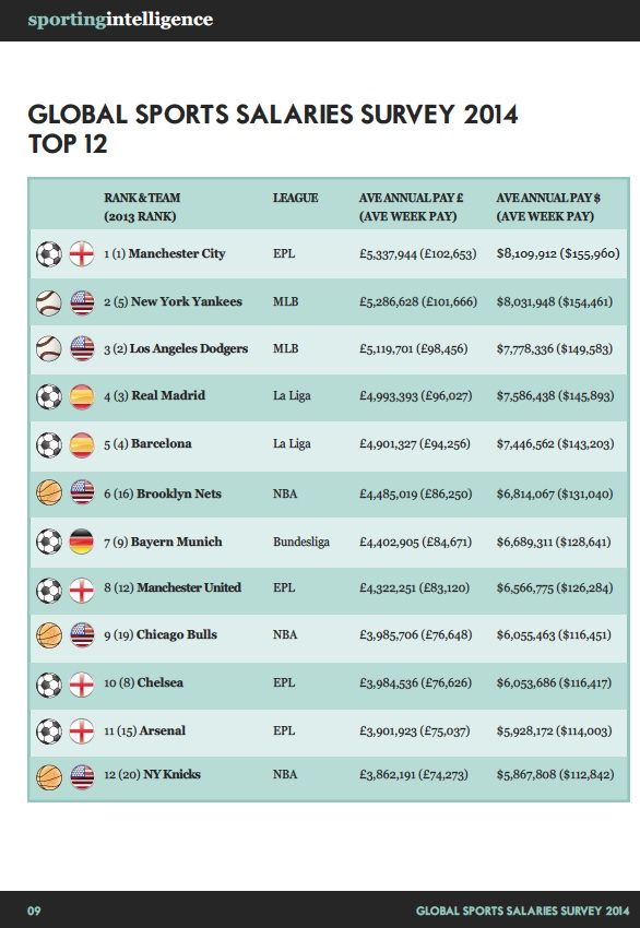 Таковы данные исследования, проведенного Sportingintelligence’s Global Sports Salaries Survey совместно с ESPN The Magazine: клуб шейха Мансура платит игрокам в год в среднем более 5,3 миллиона фунтов стерлингов (102 653 фунтов в неделю). Это больше, чем другие богатейшие команды мирового спорта, включая участников профессиональных североамериканских лиг. В первую пятерку рейтинга попали бейсбольные гиганты "Нью-Йорк Янкиз" и "Лос-Анджелес Доджерс", расположившиеся на втором и третьем месте соответственно, а также испанские футбольные гранды "Реал" и "Барселона". Опубликованный список 12-ти клубов выглядит следующим образом: