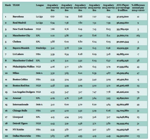 Примечательно, что по итогам пяти лет, то есть всего срока, что проводятся подобные исследования, лидером среди всех клубов мирового спорта по среднему размеру годовой зарплаты является "Барселона" – 37,9 миллионов долларов против 36,9 у "Реала", расположившегося на второй позиции. Лидер 2014 года - "Манчестер Сити" – четвертый (31,6):
