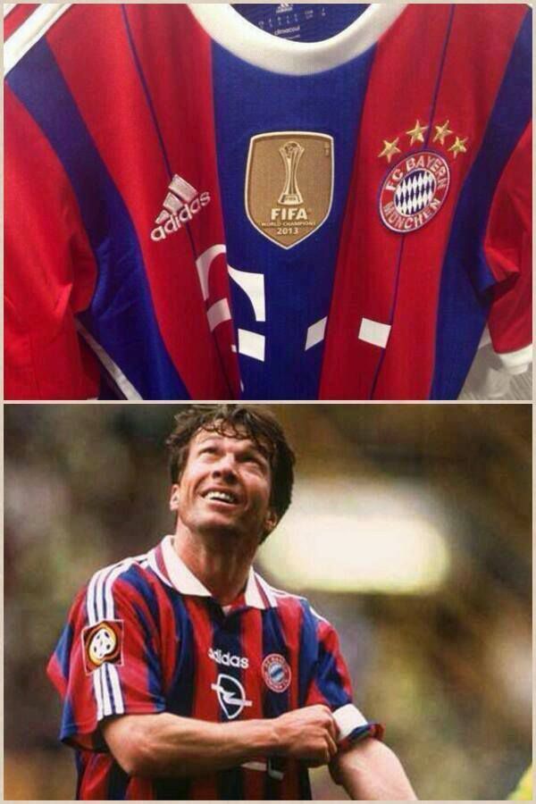 Новая форма мюнхенского клуба исполнена в красно-синюю полоску с белым воротником и содержит золотую эмблему за победу на клубном чемпионате мира 2013 года. Широкие красные линии, преобладающие на футболке, разделяют тонкие полосы синего цвета. Такой вариант формы напоминает классические комплекты "Баварии", например, образца сезона-1996/97, когда капитаном команды был Лотар Маттеус.