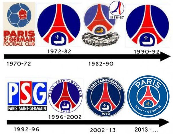Французский клуб, несмотря на довольно молодую историю, имеет на своем счету несколько заметных изменений эмблемы: в начале 70-х годов она представляла собой пятнистый голубой мяч с символом города, красным кораблем, внутри. Но уже в 1972 году дизайнеры подготовили вариант, ставший основой для всех последующих вариаций: красная Эйфелева башня на синем фоне и в белом обрамлении, а у подножия – колыбель с лилией. Единственным серьезным отступлением от обозначенного стиля стал вариант 1992-1996: на нем были изображены три прямоугольника, в каждый из которых были вставлены заглавные буквы Р, S и G.