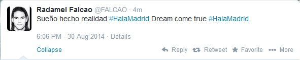 Вечером зарубежные СМИ распространили сообщение о том, что сам Фалькао написал в твиттере: "Мечта сбылась. Вперед, Мадрид" – и спустя несколько минут якобы удалил эту запись из микроблога. Однако очень скоро футболист официально заявил, что никаких подобных твитов не размещал, а появившийся в интернете скриншот – не более чем фотомонтаж.