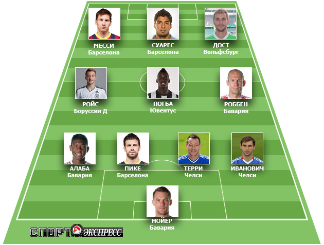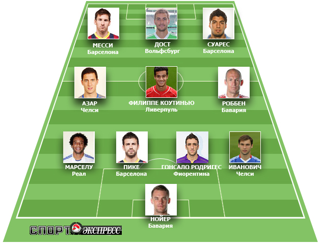 Вариант "СЭ" выглядит так: Нойер; Иванович, Гонсало Родригес ("Фиорентина"), Пике, Марселу ("Реал"); Роббен, Филиппе Коутинью ("Ливерпуль"), Э.Азар ("Челси"); Суарес, Дост, Месси.