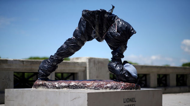 Лео не очень похож на себя - скорее на Криштиану Роналду. Но претензий к работе в целом быть не может - это явно звезда футбола. А вот у кого-то они были и еще какие. Сначала вандалы лишили статую верхней половины тела. Оставшиеся "ноги" рабочие замотали пакетами, но и они не спасли от усердных грабителей. В конце концов, остались только мяч и бутсы. Но что-то в этом есть, такой вот футбольный арт-хаус.