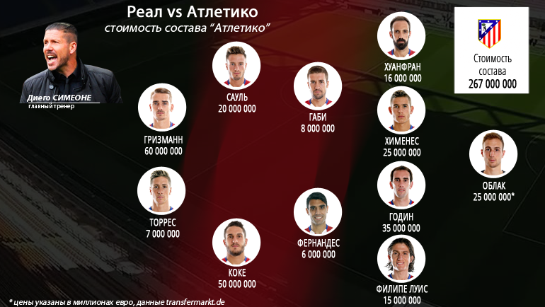 "СЭ" с помощью Transfermarkt.de сравнил стоимость ориентировочных составов соперников по финалу Лиги чемпионов, "Реала" и "Атлетико". "Первые одиннадцать" "Королевского клуба" оцениваются в 485 миллионов евро против 267 у "индейцев".