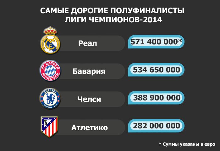 Среди полуфиналистов текущего розыгрыша Лиги чемпионов наиболее дорогим составом, согласно авторитетному порталу transfermarkt.de, обладает "Реал". Стоимость игроков "Королевского клуба" оценивается в 571 миллион евро. Их мадридские земляки – "Атлетико" – стоят примерно в 2 раза меньше – 282 миллиона.