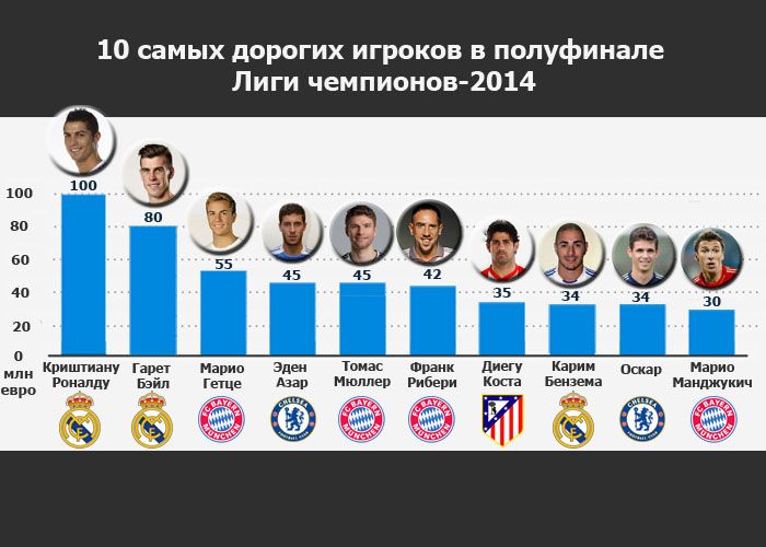 Львиная доля от общей стоимости "Реала" принадлежит форварду Криштиану Роналду (100 миллионов) и полузащитнику Гарету Бэйлу (80 миллионов) – это два самых дорогих участника 1/2 финала главного европейского клубного турнира. Третья строчка принадлежит Марио Гетце из "Баварии". В "Челси" самым дорогим игроком считается Эден Азар (45 миллионов), а в "Атлетико" – Диегу Коста (35 миллионов).