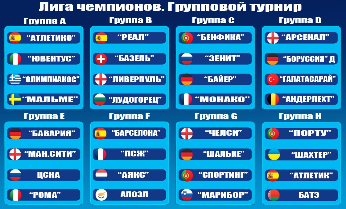 Группа E: "Бавария" (Германия), "Манчестер Сити" (Англия), ЦСКА (Россия), "Рома" (Италия).