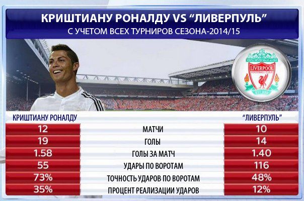 Сегодня в матче 3-го тура группового этапа лиги чемпионов "Ливерпуль" примет на "Энфилде" мадридский "Реал". Согласно цифрам предматчевой статистики форвард "Королевского клуба" Криштиану Роналду в нынешнем сезоне более эффективен в атаке, чем весь "Ливерпуль":