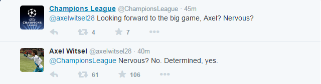 – Аксель, с нетерпением ждете важную игру? Нервничаете? – спросили у Витселя в твиттере.