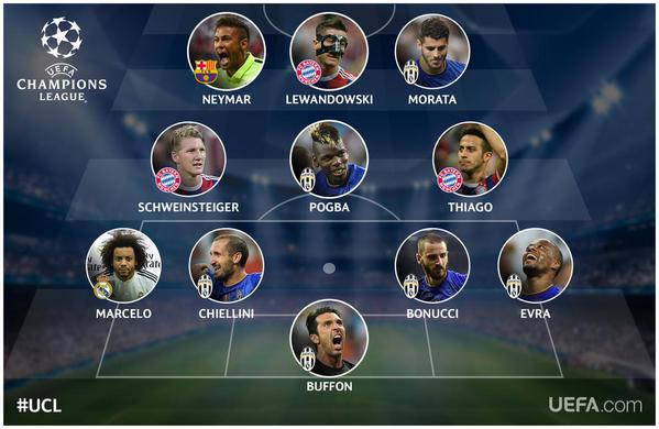 Нападающий "Реала" Криштиану Роналду снова не вошел в символическую сборную полуфинальных матчей Лиги чемпионов, сообщает пресс-служба УЕФА. Зато в ней нашлось место форварду "Ювентуса" Альваро Морате, чей гол в ворота мадридцев вывел его команду в финал турнира. Полностью сборная ответных игр полуфинала выглядит следующим образом: Джанлуиджи Буффон – Патрис Эвра, Леонардо Бонуччи, Джорджо Кьеллини (Все – "Ювентус"), Марселу ("Реал") – Тиагу Алькантара, Бастиан Швайнштайгер (оба – "Бавария"), Поль Погба ("Ювентус") – Альваро Мората ("Ювентус"), Роберт Левандовски ("Бавария"), Неймар ("Барселона").