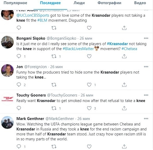 Перед началом матча группового турнира Лиги чемпионов «Челси» — «Краснодар» (1:1) три игрока российской команды не встали на колено в рамках акции Black Lives Matter (с англ. «Жизни черных важны»).