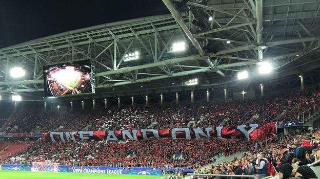 Болельщики "Спартака" устроили красочный перформанс перед матчем 2-го тура группового турнира Лиги чемпионов против "Ливерпуля". На двух фанатских трибунах появились баннеры "Спартак" Москва" и "Единственный и неповторимый". Почти все болельщики подняли над головой клубные шарфы.