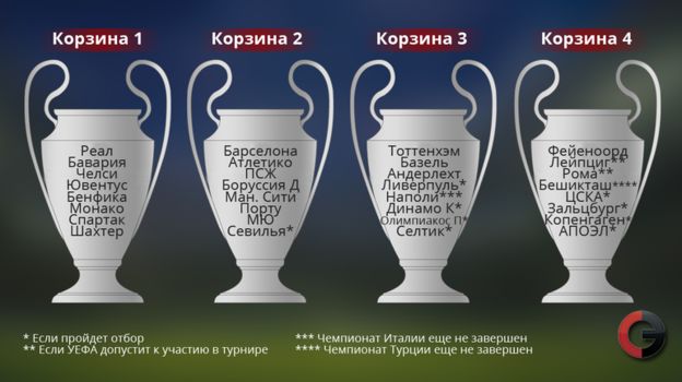 Корзина 1: Реал, Бавария, Челси, Ювентус, Бенфика, Монако, Спартак, Шахтер